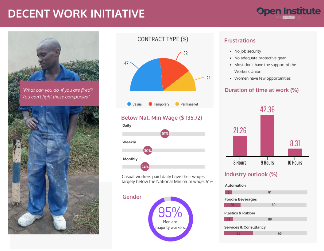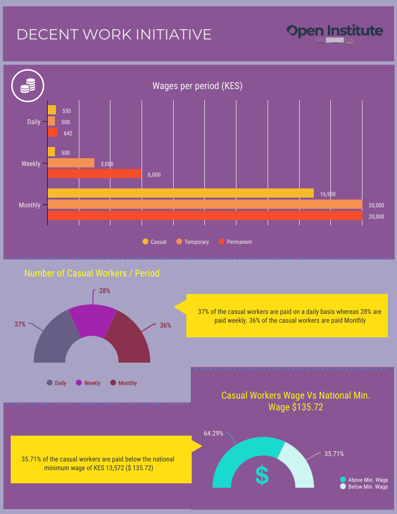 Majority of the workers we spoke to were employed as casuals in factories in industrial area and most are paid between KES. 500-600. We found that their pay computes to considerably less than the minimum wage prescribed by the government of KES. 13, 572.00 (USD 130) per month. What was worse is that we found that there are many cases of people working in the same company as casual employees for years in contravention of the Kenya Employment Act (CAP 226). Based on the fact that they are casuals, they have no protections and are at risk of being fired on a whim.